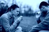 A boy and girl laugh while eating lemon slices in an outdoor setting on a field.