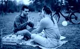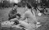 A young man and woman sit on a blanket in a park, engaging in a fun hand-clapping game during a refreshing picnic, with a bicycle and fruits visible, symbolizing leisure and bonding.