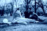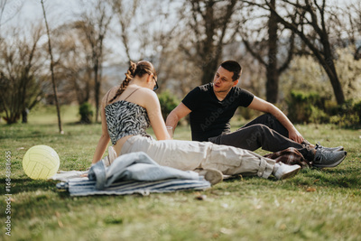 Two individuals relax and converse on a blanket in a sunny park setting, enjoying a peaceful atmosphere amidst green surroundings. A volleyball is visible beside them, suggesting leisure activities.