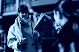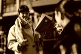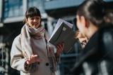 A businesswoman engaging in a discussion outdoors, holding documents, and gesturing expressively. The image portrays a natural professional interaction, teamwork, and contemporary business
