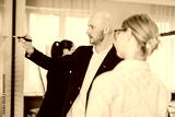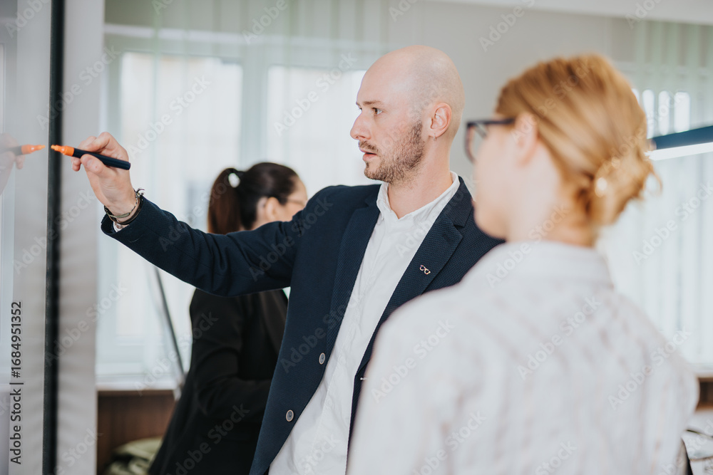 People discussing creative ideas during a business meeting, standing and collaborating at the whiteboard in a modern office, emphasizing teamwork and productivity in a collaborative environment.