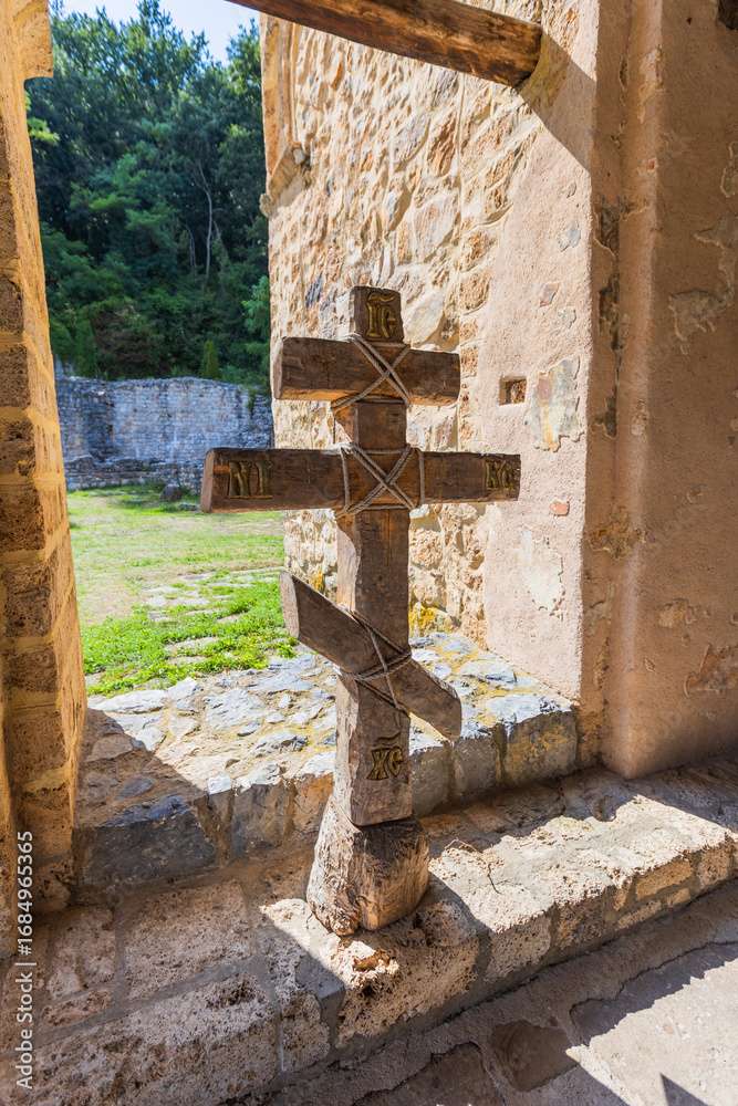 An old wooden Orthodox cross stands in the doorway of a historic stone church at Studenica Monastery in Serbia.
