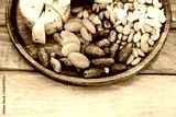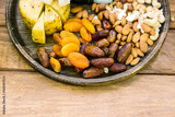 cooking, setting, country life concept. on the dark colored wide flat wooden plate there are dates, dried apricots, almonds, cashew and cheese with spices