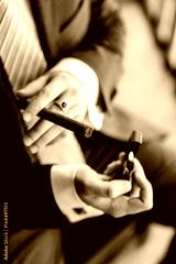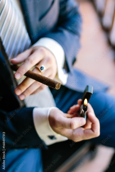 wedding, elegance, high fashion concept. tough arms of man, dressed in dark blue costume for celebration with snowy white cuffs, lightening big expensive cheroot