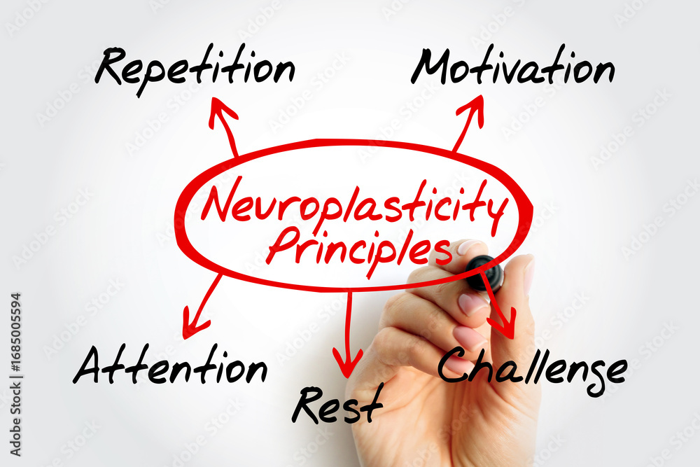 Mind map of Neuroplasticity Principles featuring key concepts such as Repetition, Motivation, Attention, Challenge, and Rest. Ideal for use in educational, medical, psychology