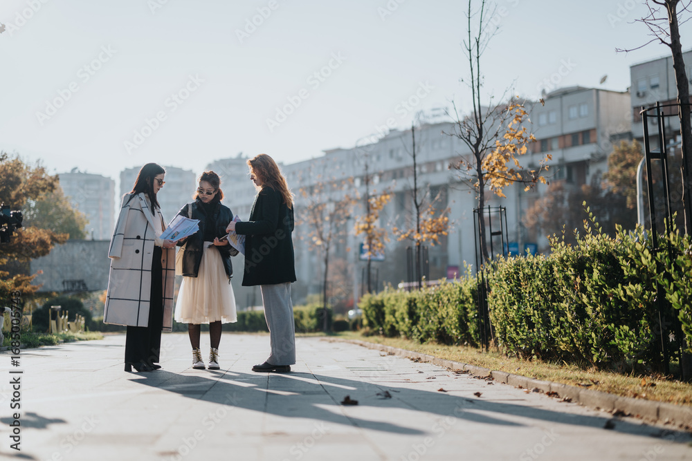 Three professional women discuss plans and review documents in an outdoor urban setting.