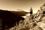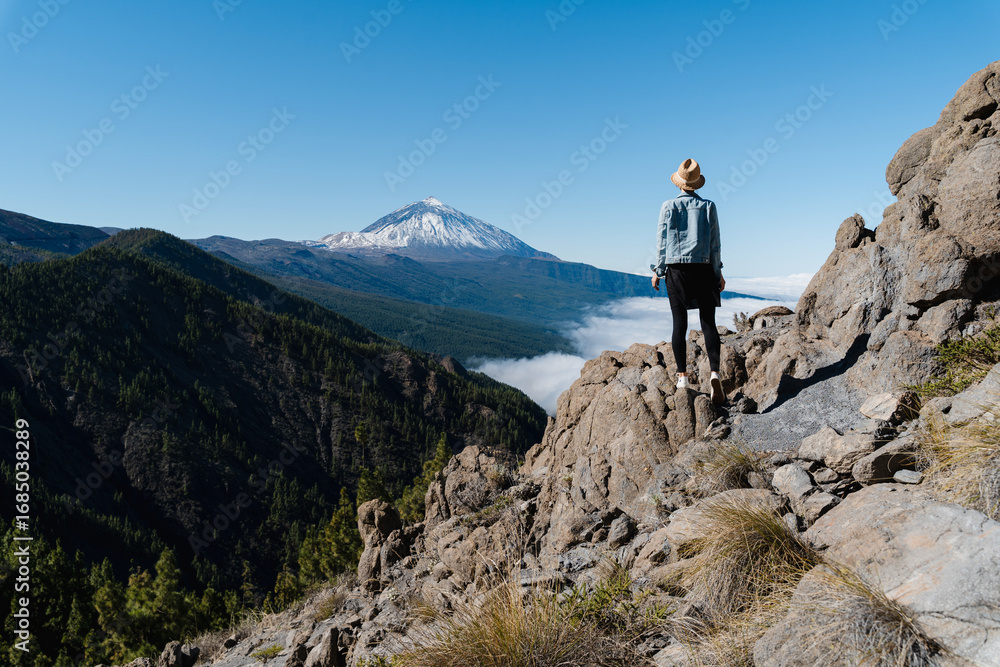 Tourist standing on mountain admiring breathtaking view of volcano Teide, Tenerife, Canary, Spain.