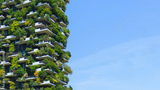 A stunning view of a green covered sustaineble building showcases innovative architecture blending nature and urban living under clear sky.