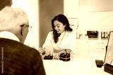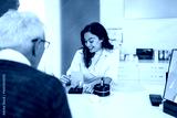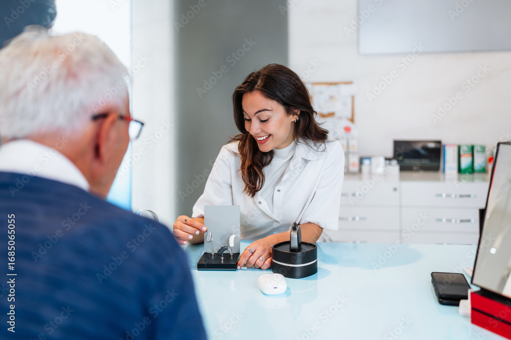 Audiologist is presenting a hearing aid device to a senior patient during a consultation in a modern audiology clinic, discussing options for improving hearing health