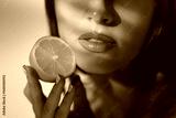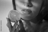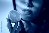 Woman face with lemon slice held near lips in artistic wellness concept. Concept of skincare, natural beauty, citrus freshness, wellness lifestyle and editorial minimalism.