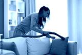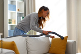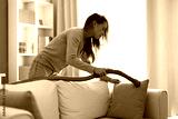 Housewife cleaning sofa with vacuum cleaner in living room