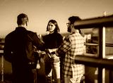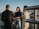 Business colleagues engage in a brainstorming session on a rooftop balcony at sunset, embracing diversity and creativity in a relaxed atmosphere. The multicultural team discusses innovative ideas
