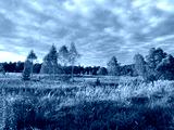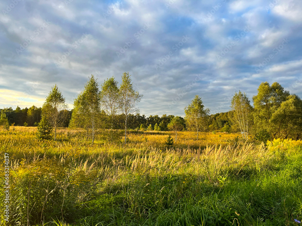 Autumn. Beautiful evening landscape: grasses, trees, sky with clouds.