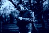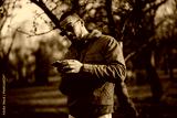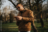 A casually dressed man stands in a shaded park while using his smartphone during a calm afternoon.