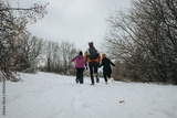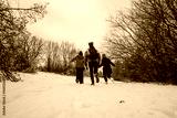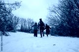 Group of friends exploring a snow-covered forest on a winter day, capturing the essence of friendship, nature, and seasonal joy.