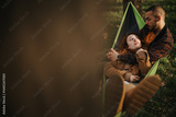 A young couple enjoys a relaxing moment in a hammock in a serene park setting, surrounded by nature and warm autumn colors, embracing feelings of connection and outdoor tranquility.