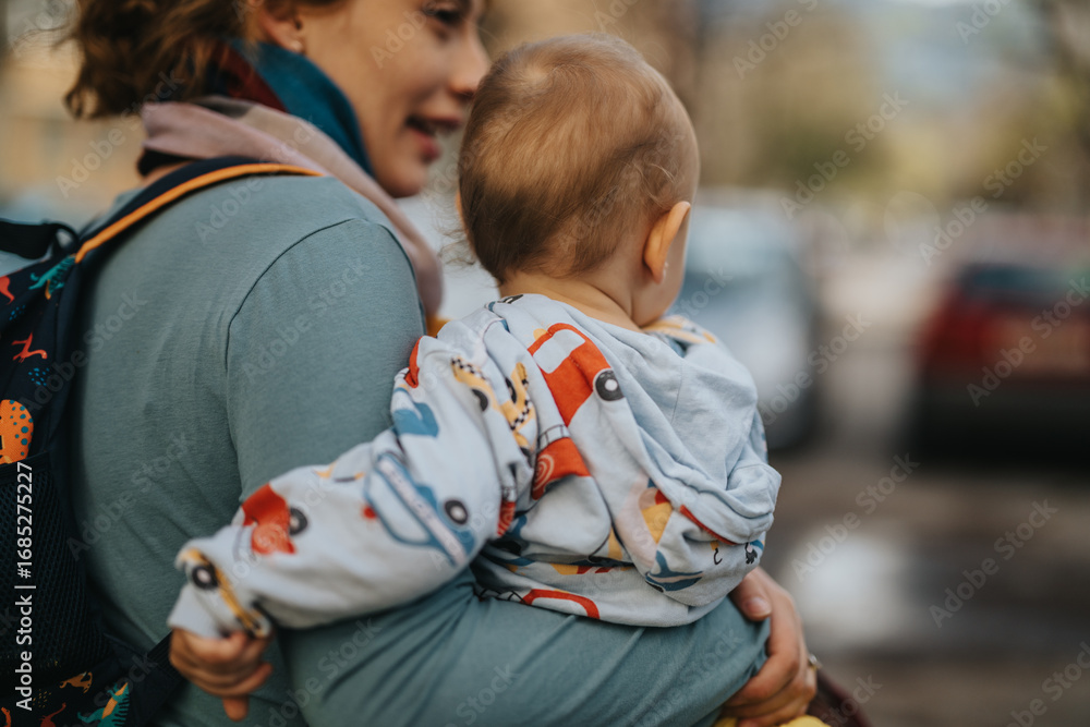 A caring mother carrying her baby in her arms while enjoying the outdoors. This warm scene captures the bond and love between a parent and child in a natural environment.
