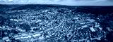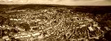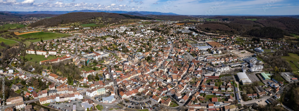 Aerial panoramic view around the old town and city Héricourt in France on a sunny afternoon