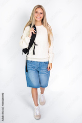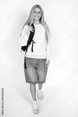 Portrait of teenager student girl holding notebook looking at camera on blue studio background