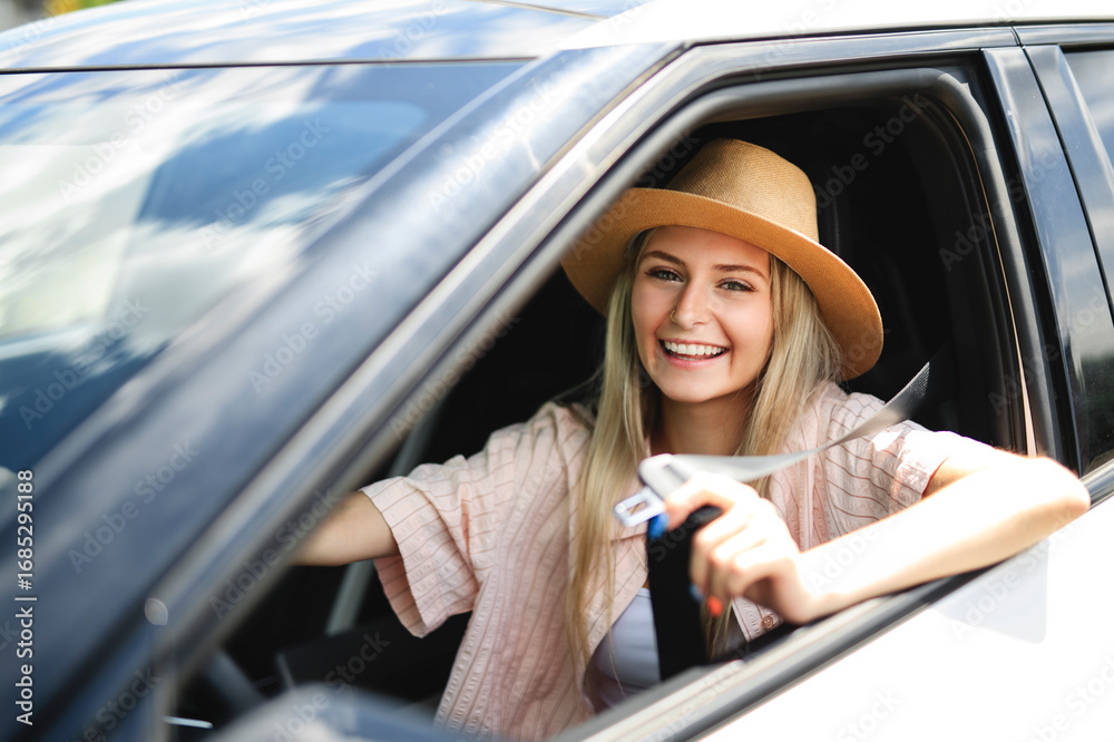Beautiful young girl driver with with her white car