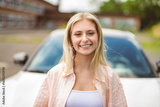 Beautiful young girl driver with with her white car