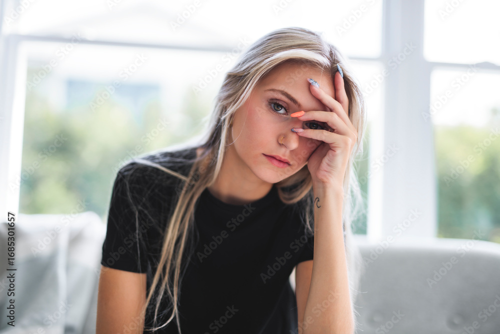 Portrait beautiful young woman at home on the living room with black shirt look sad