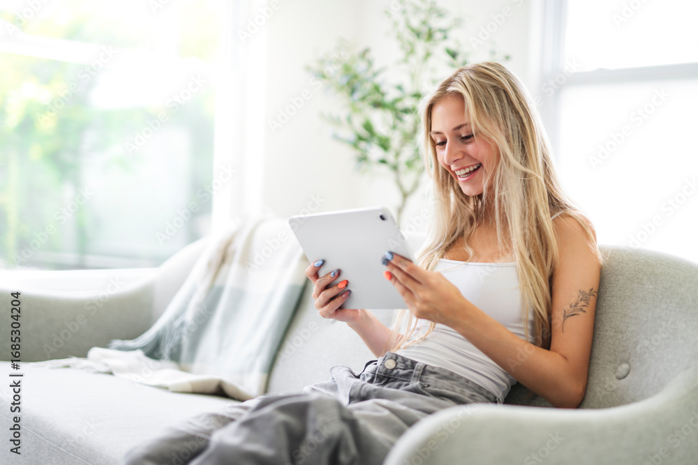 Portrait beautiful young woman at home on the living room using tablet