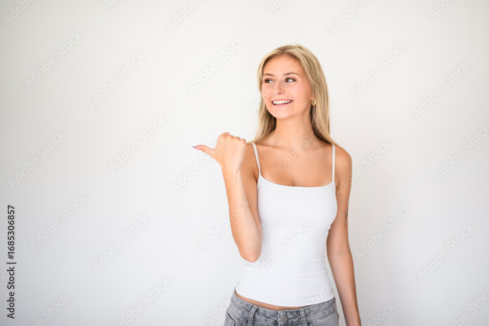 Pretty 18 years old blonde girl posing in studio and pointing