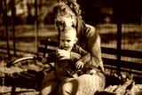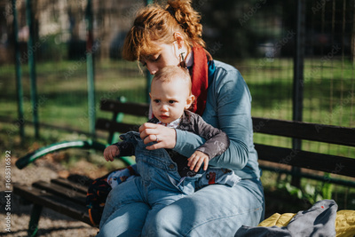 A mother enjoys a peaceful moment at the park, holding her baby affectionately. They are seated on a wooden bench surrounded by greenery and fenced surroundings on a clear day.
