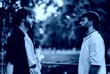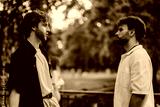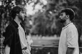 Young men engage in a conversation while standing in a peaceful park. The sunlight filters through the trees, creating a serene backdrop emphasizing interaction and connection in an outdoor setting.