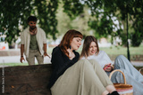 Two friends are seated on a park bench sharing a laugh while using a smartphone. A third person is visible approaching in a playful manner, surrounded by green scenery creating a carefree atmosphere.