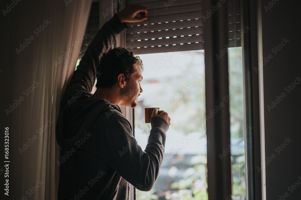 A young man holding a cup of coffee stands by the window in thoughtful contemplation, taking in a peaceful moment indoors in casual attire.