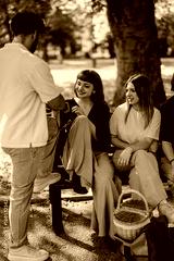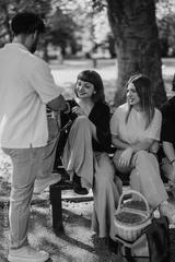 Adults socializing and enjoying a picnic in a park, with joyful expressions and baskets.