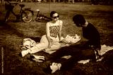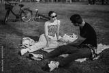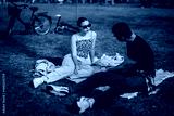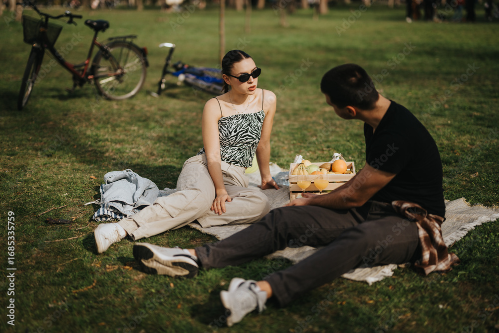 A young man and woman relax together on a picnic mat surrounded by grass. The setting includes bicycles, a basket of fruits, and a calm, sunny atmosphere in a serene park.