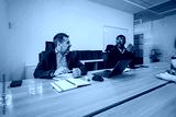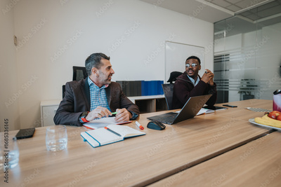 Two businesspeople sit at a conference table, discussing plans with notes, a laptop, and documents, reflecting collaboration in a professional setting.