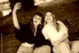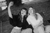 Two young women sitting on a wooden bench in a park, smiling and taking a selfie with a smartphone. The outdoor setting emphasizes their friendship and enjoyment of the natural environment.
