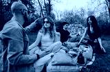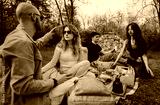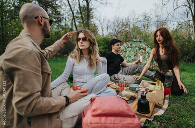 A group of young adults sitting together on a blanket outdoors, sharing food, and talking in a peaceful natural environment. They have picnic items, a tent, and enjoy a sunny day.