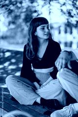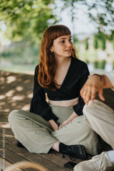 A young woman sits outdoors on a wooden platform, engaging in a casual discussion with a friend while surrounded by a lush park atmosphere.