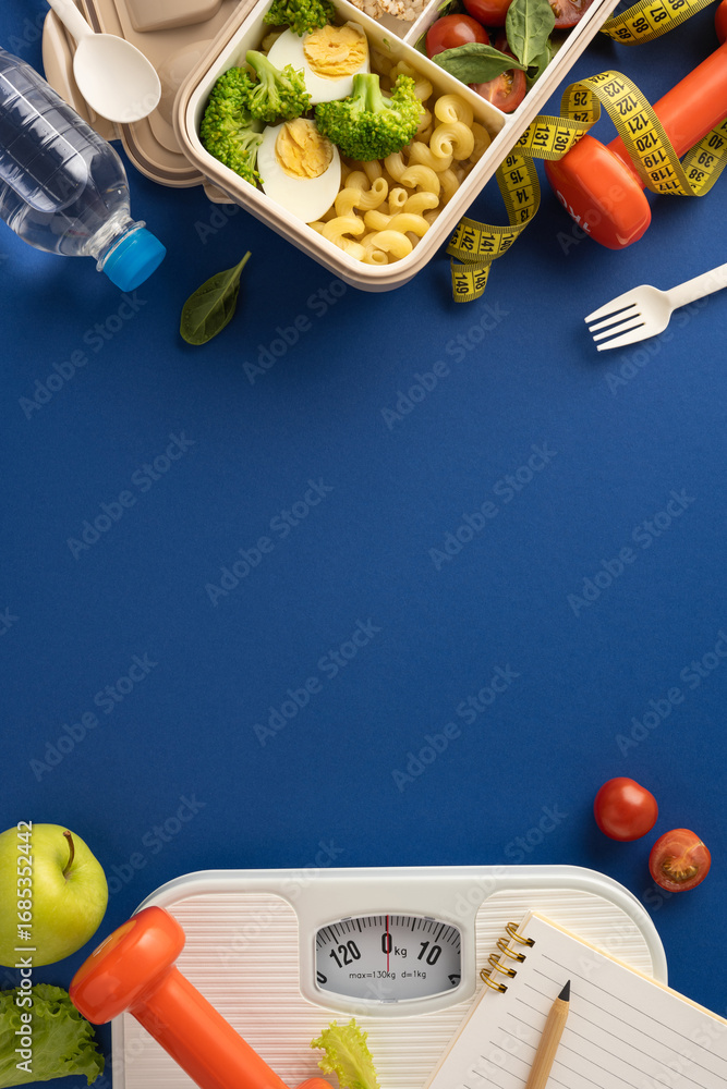 Balanced vertical food and fitness gear arranged with focus on diet, health, and weight loss