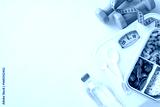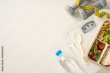 Top view of a healthy meal prep with a water bottle, fitness items, and vegetables