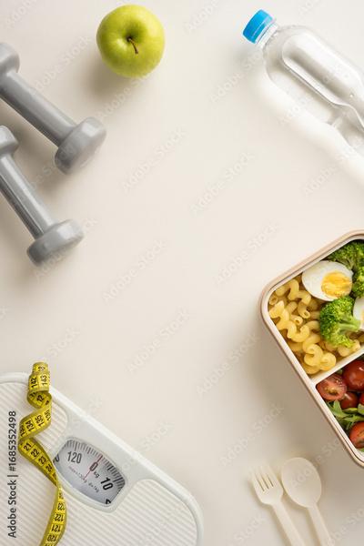 Showcasing a vertical meal portion, fitness equipment, and an apple representing health and balance