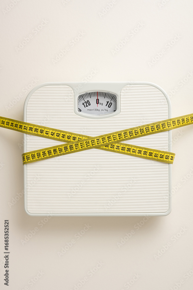 Bathroom vertical scale wrapped with measuring tape symbolizing weight loss, fitness, and healthy lifestyle