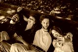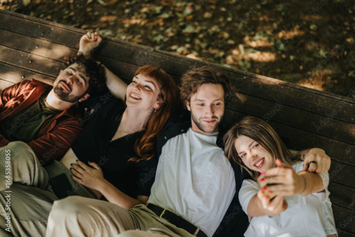 A group of four friends share a happy moment outdoors, lying together on a wooden bench under shaded trees, enjoying nature and camaraderie, with one capturing the moment in a selfie.