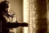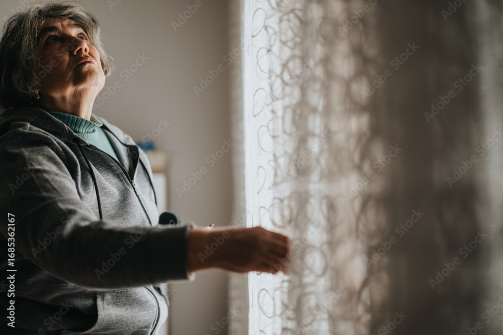 A senior woman stands by a window, gazing pensively through a delicate curtain in a calm and quiet indoor environment.