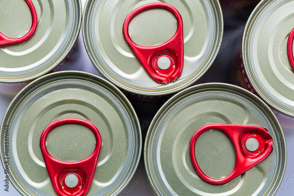 Close-up top view of canned food container,Four metal cans of fish on a slate stone, close-up, top view.