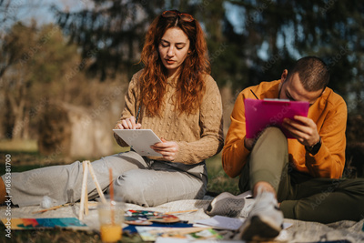 A couple seated outdoors, passionately engaging in artistic painting on sketchpads under natural sunlight with vibrant art supplies.