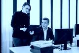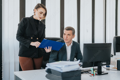 Colleagues work collaboratively, reviewing and discussing business documents in a well-lit office environment. Emphasizing teamwork, professionalism, and a focused corporate atmosphere.