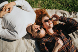 A couple lies on a blanket outdoors, relaxing and enjoying a bright sunny day. Both individuals sport sunglasses, indicating a carefree vibe while experiencing an open, breezy natural environment.