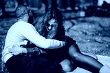 A playful couple sits outdoors on a sunny day enjoying the natural surroundings in a park.
