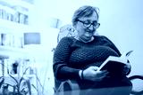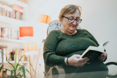 A senior woman reads contentedly in her living room, surrounded by books and warm lighting, embodying relaxation and love for literature. A moment of tranquility and personal comfort.